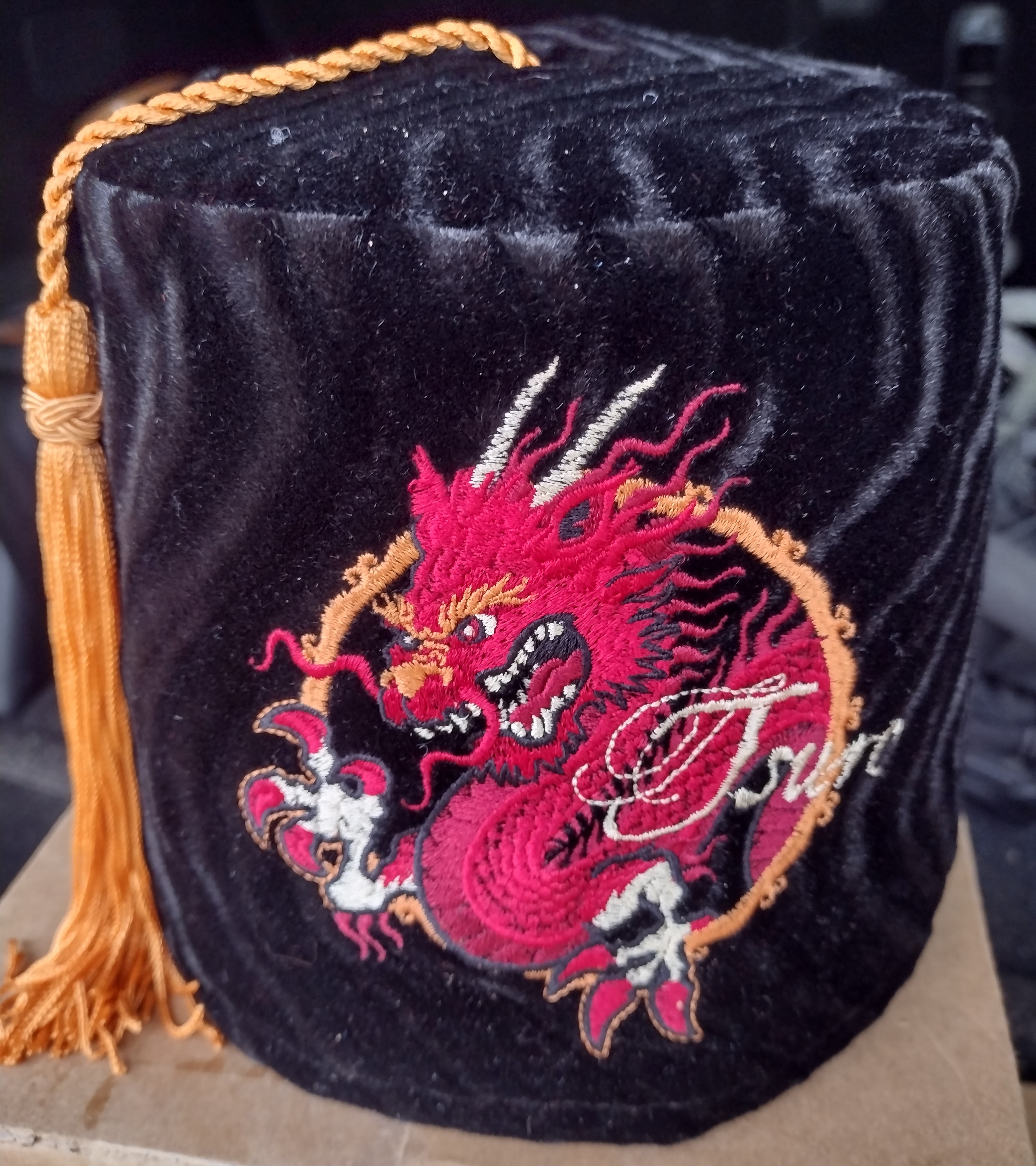 Handmade fine embroidered velvet fez hat featuring Tsuro